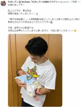 ワタナベエンターテインメント所属の“れきしクン”ことタレントの長谷川ヨシテルが2日、SNSを通じ、第1子男児が誕生したことを発表した。