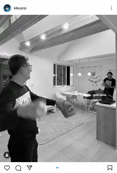 「(夫、始球式前のプチコソ練。)」とコメント。貴子の父で元プロ野球選手・新井宏昌氏と夫・啓太とのキャッチボール写真を掲載した。