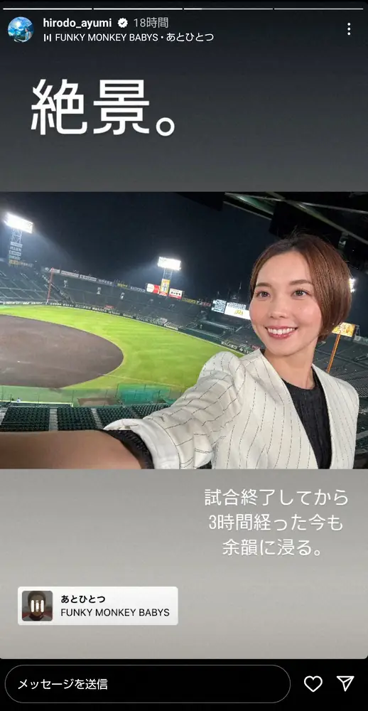 ヒロドアナは、自身が担当するテレビ朝日系「報道ステーション」のスポーツコーナーで、日本シリーズの結果を甲子園球場から中継。その告知と、試合後の余韻などを写真で伝えた。