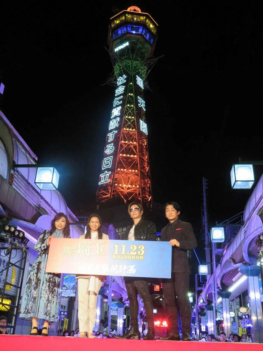 大阪・通天閣をバックに映画「翔んで埼玉~琵琶湖より愛をこめて~」のスペシャルイベントを行った(左から)ハイヒール・モモコ、二階堂ふみ、GACKT、片岡愛之助