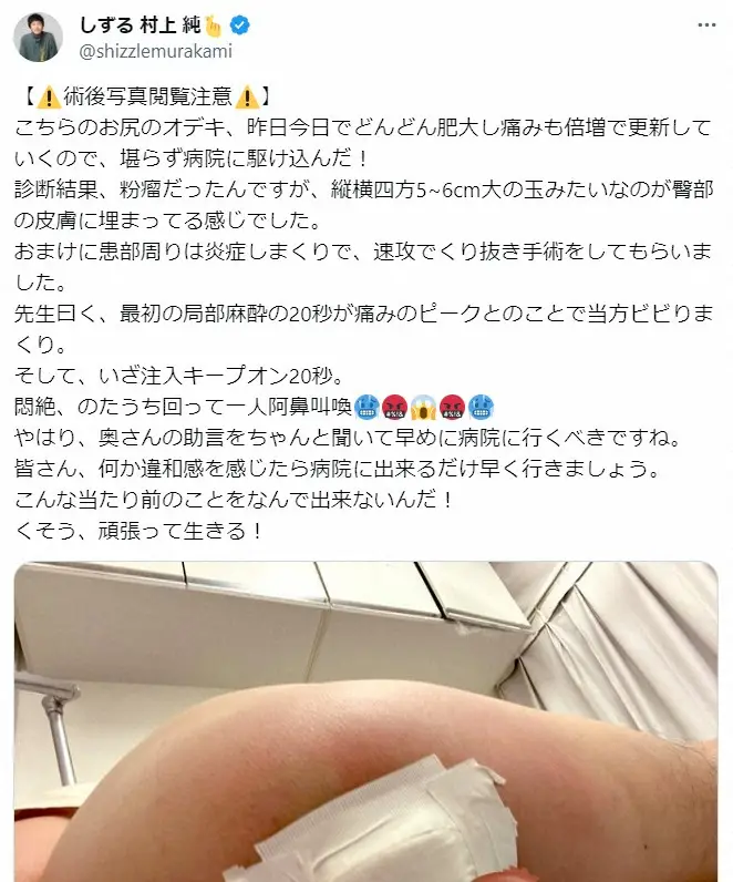 お笑いコンビ「しずる」の村上純 Photo by スポニチ しずる村上、まさかの緊急手術 尻の違和感を放置した結果…激痛に「奥さん… ギャラリーで見る この記事のフォト 2023年11月08日の画像一覧 もっと見る 2023年11月08日の画像をもっと見る