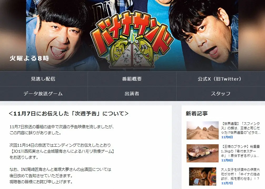 TBSの人気バラエティー番組「バナナサンド」は8日、公式サイトを通じ、7日放送中に映し出された次週の予告内容に誤りがあったとして謝罪した。