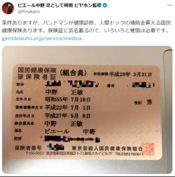 また“バンドマン組合のようなもので健康診断が受けられればいいのに”などの声が寄せられると「条件ありますが、バンドマンが健康診断、人間ドックの補助金貰える国民健康保険あります」といい、「東京芸能人国民健康保険組合」の保険証を公開した。