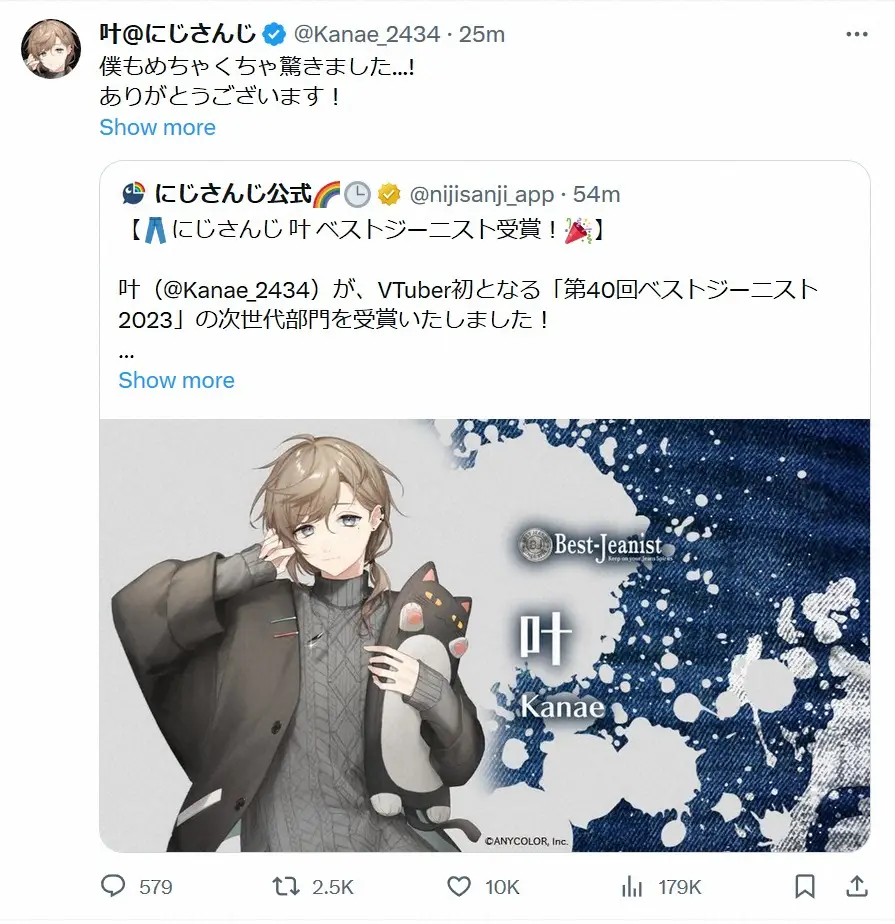 VTuberの叶が9日、自身のSNSを更新。「ベストジーニスト2023」の「次世代部門」に初めてVTuberから選出されたことについて投稿した。