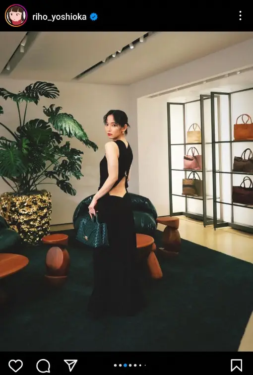 背中の部分が開いている黒いドレス姿で、同ブランドのバッグなどを手に取っている写真などをアップした。