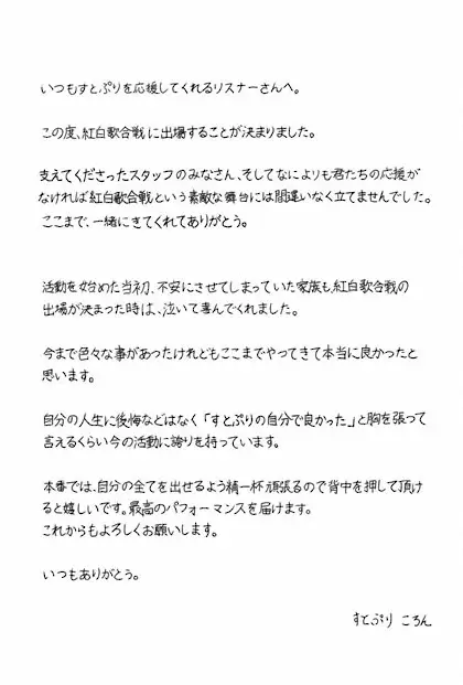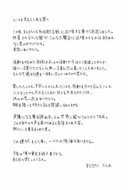 紅白出場を喜ぶ「莉犬」直筆メッセージ Photo by 提供写真 紅白初出場 すとぷり4人が直筆コメントで喜び「何者でもなかった僕が…」 ギャラリーで見る この記事のフォト 2023年11月13日の画像一覧 もっと見る 2023年11月13日の画像をもっと見る