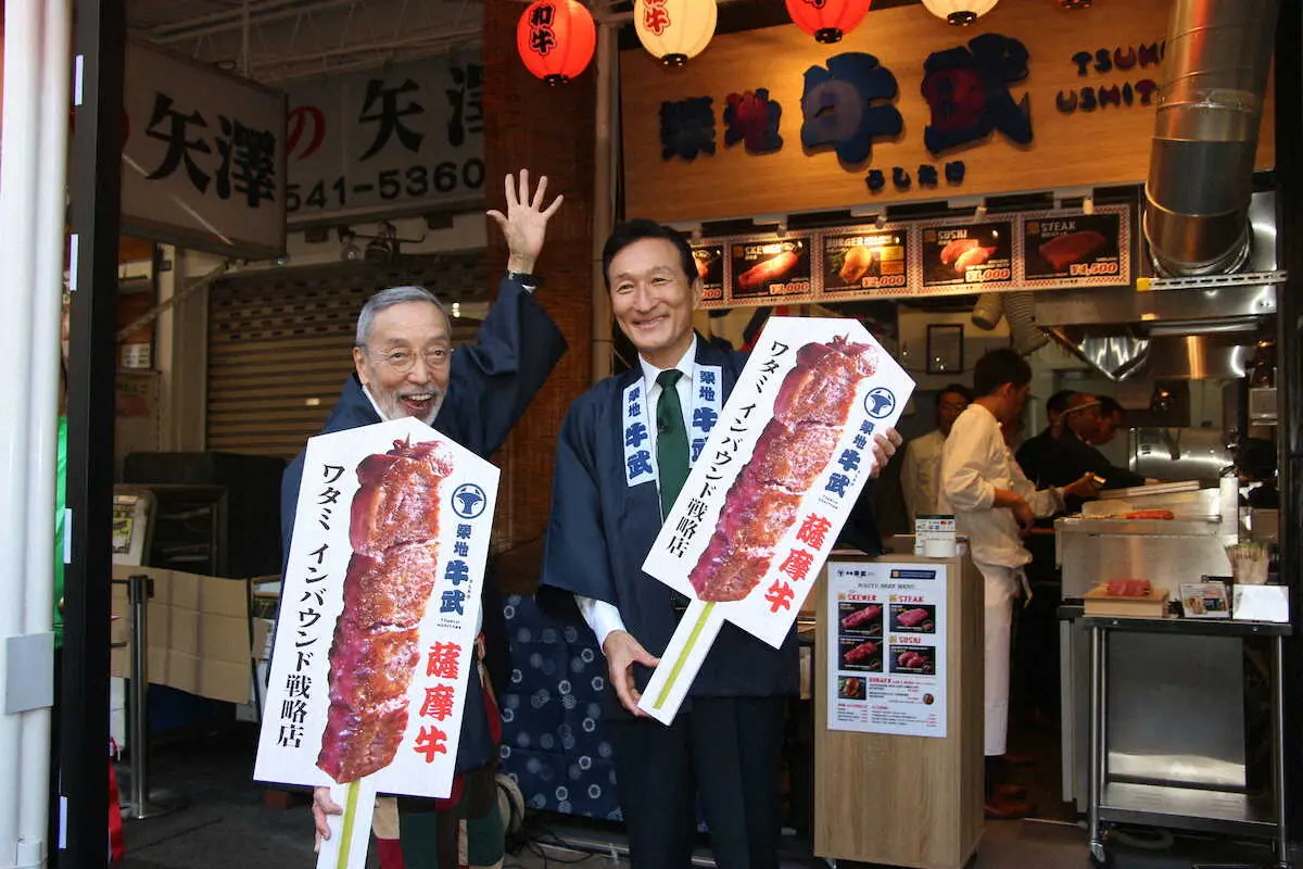 店先では“薩摩牛4%の奇跡”と呼ばれる最高級品質の牛串(3000円)を頬張ると「びっくりするくらいおいしい!」とPRした。店舗は外食や介護などの事業を展開するワタミが、インバウンドの需要再拡大を受けて、世界から観光客が集まる築地に19日にオープンするもの。提供する牛串は、A5ランクの中でも最高品質で、1キロ1万2000円以上。原価は40%を超えるという。