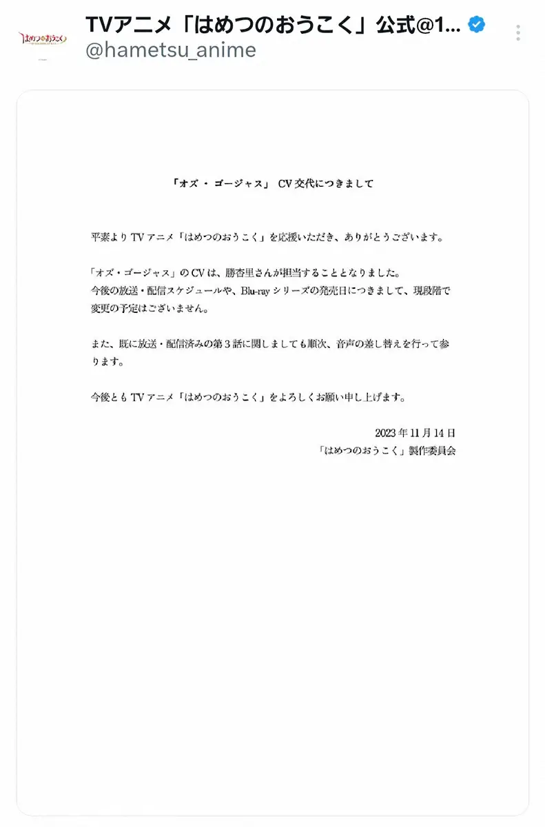 「はめつのおうこく」公式はX(旧ツイッター)などで「『オズ・ゴージャス』のCVは、勝杏里さんが担当することとなりました。今後の放送・配信スケジュールや、Blu-rayシリーズの発売日につきまして、現段階で変更の予定はございません」と報告。池田容疑者が出演している第3話は放送・配信済みだが、「既に放送・配信済みの第3話に関しましても、順次、音声の差し替えを行って参ります」とした。