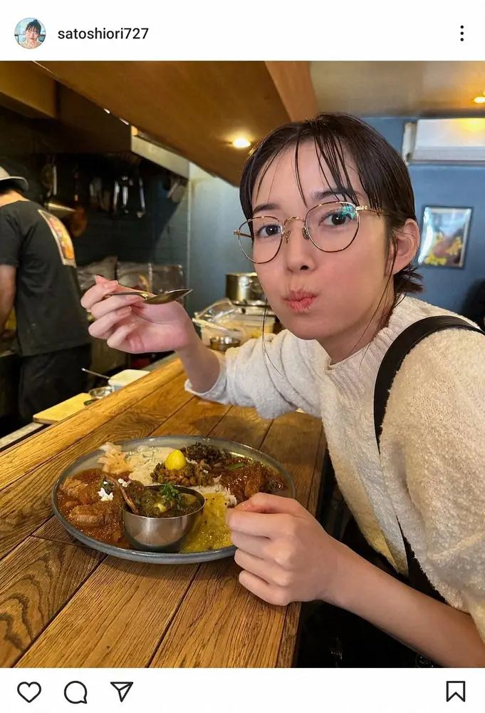 佐藤は「大好きなカレー屋さんへ」とコメント。眼鏡と白ニット姿で、「いつ行ってもメニューが違う」というカレーを食べる写真を公開した。