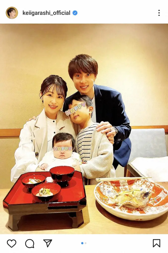 バスケットボール元日本代表でB1群馬のPG五十嵐圭(43)が15日、自身のインスタグラムを更新。妻でフリーアナウンサーの本田朋子(40)、長男と共に8月1日に出産を発表していた第2子長女のお食い初めに出かけた様子を披露した。