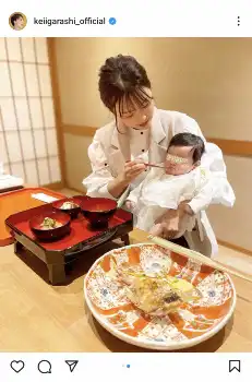 本田が長女を抱き抱えて食事を口に運ぶショットも投稿した。ハッシュタグでは「娘」「お食い初め」などと添えた。