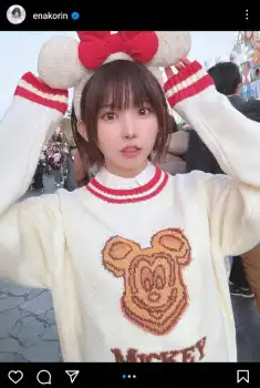 「ディズニー楽しんでるとこよいっちが撮ってくれた」とつづり、ミッキーマウスのカチューシャ、セーターにミニスカート姿の写真をアップした。