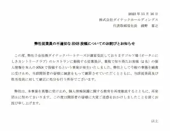 ゴルフ場の予約業務を担っていた株式会社ダイナックパートナーズを運営する株式会社ダイナックホールディングスは16日、騒動を受け「弊社従業員の不適切なSNS投稿についてのお詫びとお知らせ」を掲載。