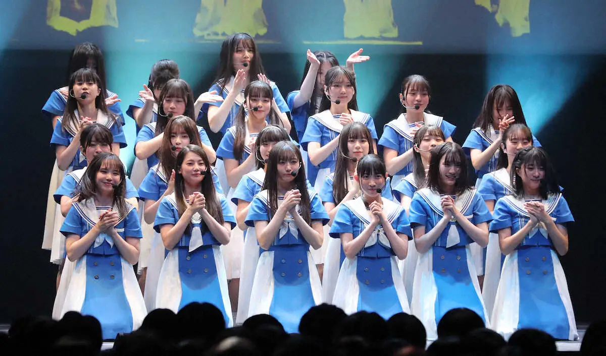 この日は大阪城ホール天守閣前の特設ステージでデビューシングル曲「青空について考える」を披露。出番前に登場した「純烈」が傘を差すなど、グループ名を体現するような空模様だった。イントロのフォーメーションでは、右上のポジションなどがぽっかり空いたような状態だったが、緊急事態をものともせず乗り越えた。