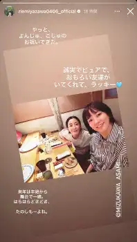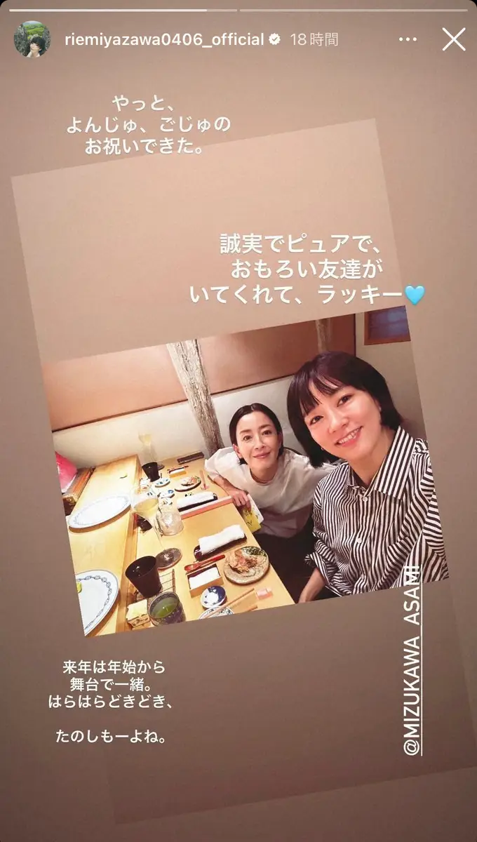 女優の宮沢りえ(50)が17日までに自身のインスタグラムのストーリーズを更新。同じく女優の水川あさみ(40)とのツーショットを披露した。