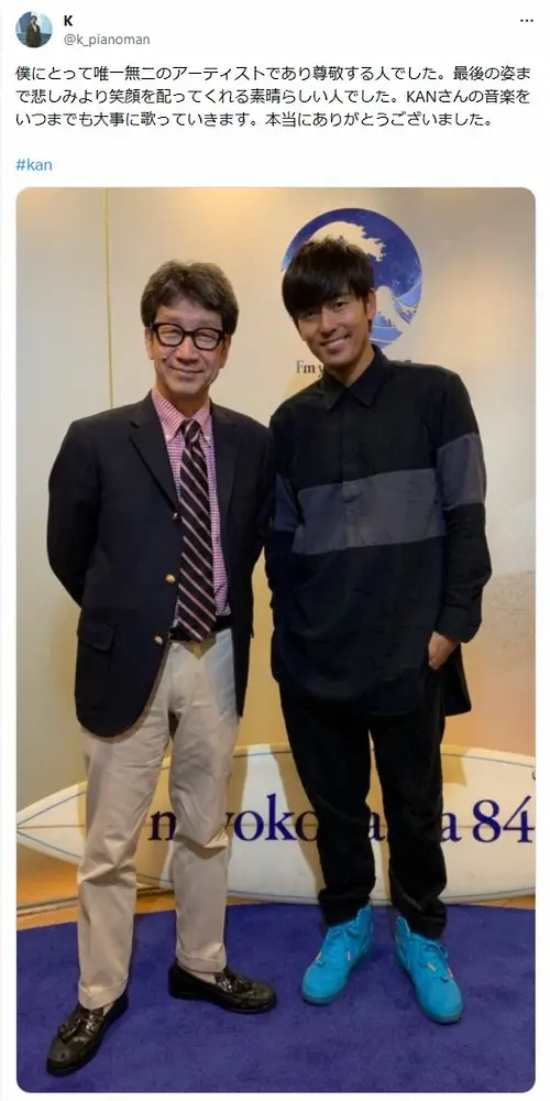 「最後の姿まで悲しみより笑顔を配ってくれる素晴らしい人でした」と回顧すると、「KANさんの音楽をいつまでも大事に歌っていきます。本当にありがとうございました」とつづった。