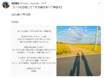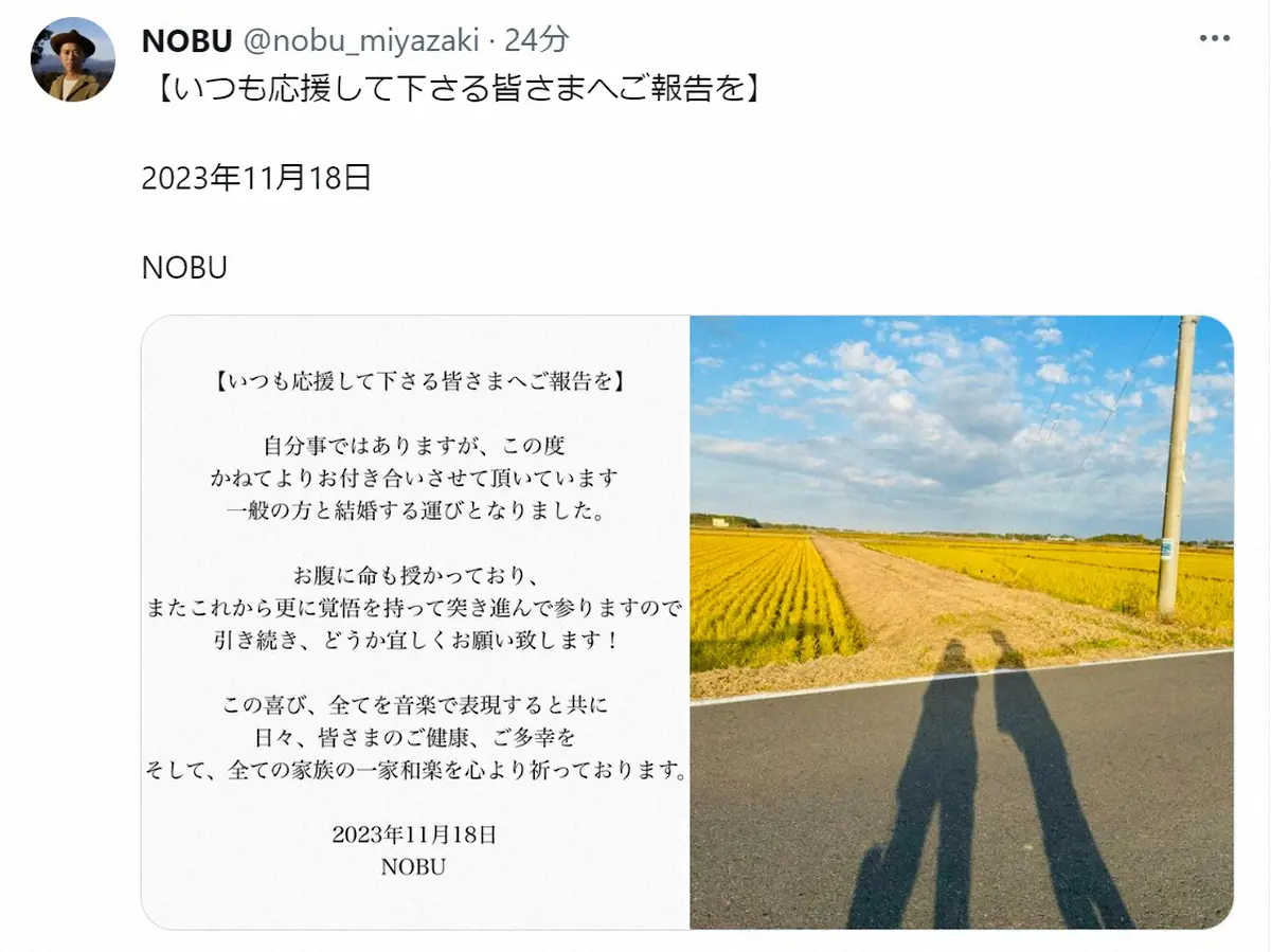 NOBU Photo by スポニチ 歌手・NOBU 一般女性との結婚発表「お腹に命も授かっており」 今年3月に… ギャラリーで見る この記事のフォト 2023年11月18日の画像一覧 もっと見る 2023年11月18日の画像をもっと見る