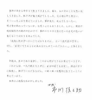 事件の日から今日まで生きてきました。毎日、あの日のことを思い返してきました。私だけが生き延びてしまった、父と母に申し訳ない、そういったことを考えていました。事件後も、死んでしまいたい、明日命が終わっていないか、と思うこともありました。しかし、周囲や病院関係者の助けのおかげで、事件のときほど真に迫った自死の思いが生じることはありませんでした。