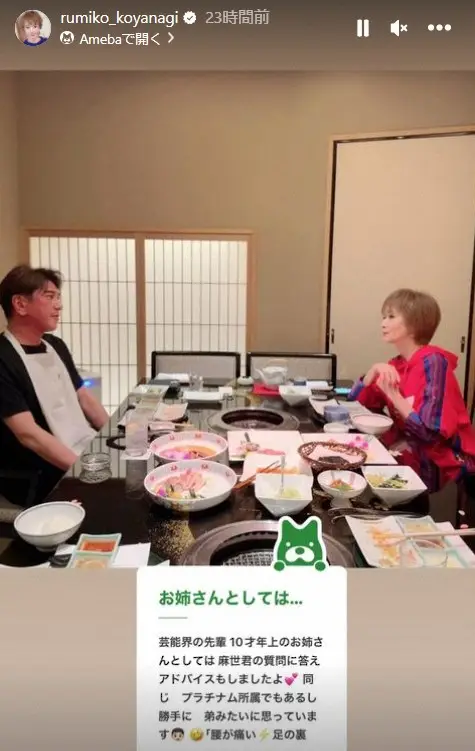 「芸能界の先輩 10才年上のお姉さんとしては麻世君の質問に答えアドバイスもしましたよ」とし、「同じ プラチナム所属でもあるし勝手に 弟みたいに思っています」とも。「麻世君 やっと解放されたんだから心も体も鍛えて強くなろう」とエールを送った。