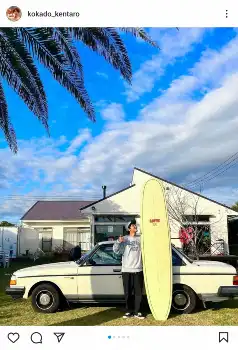 そして「愛車のvolvo240と同じカラーリングに仕上げてくれました!めっちゃ嬉しい!!」と、愛車の隣で、「LOTTI」のロゴが入ったサーフボードを見つめる写真などを掲載した。