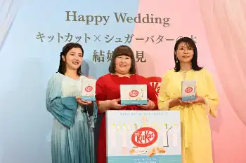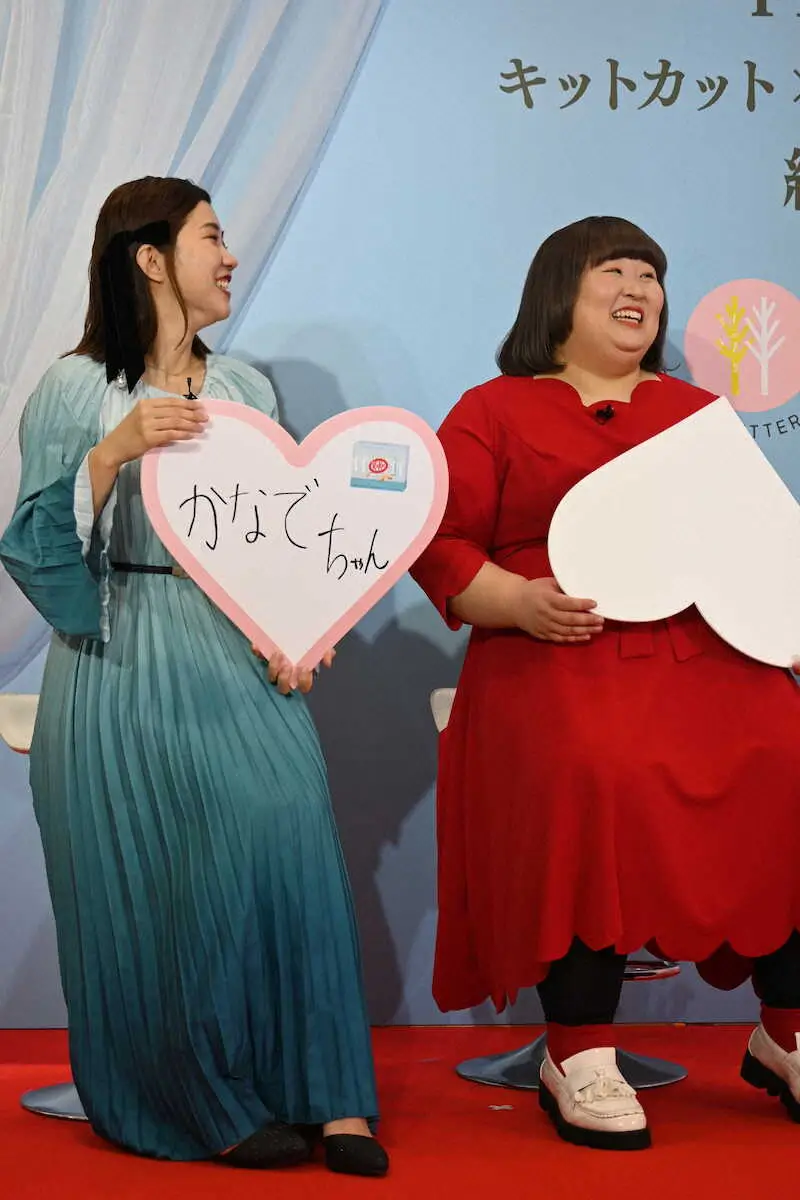 女性お笑いトリオ「3時のヒロイン」のかなで(31)と福田麻貴(35)が22日、都内で行われた「キットカット」と「シュガーバターの木」のコラボレーション新製品発表会見に出席した。