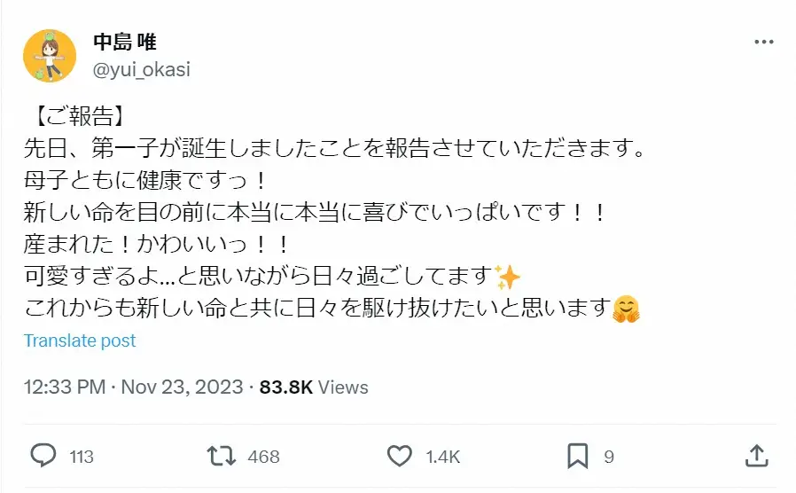 この投稿にフォロワーらからは「唯さん、第一子誕生おめでとうございます」「母子共に健やかにお過ごしできますようにお祈り申し上げます」「ホンマにおめでとう!!!!」「ステキ あかちゃんの健やかな成長を祈ってます!」「すごい!!唯さんお母さんになったの!?すごー!!おめでとうー!!」などの祝福の声が寄せられている。