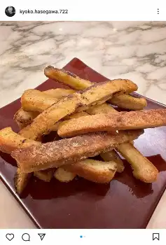 長谷川は「ある食卓の時間。子ども達がふと、"ママの料理で好きな物"を言い始めました」とコメント。その中で出て来た、「子ども達が幼稚園に通っていた頃、よく作っていた」という「パンの耳のお菓子」について振り返った。