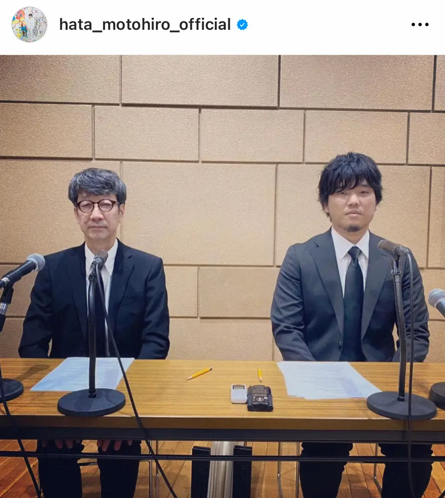 「カサナルキセキ」発売時の企画“謝罪会見動画”でのKANさん(左)と秦基博(秦基博の公式インスタグラムhata_motohiro_officialより