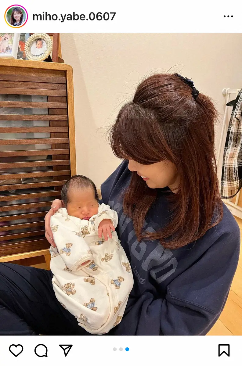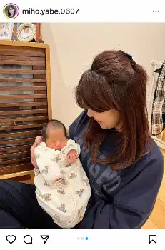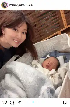 「#赤ちゃん」「#第三子」「#赤ちゃんと」「#おめでとう」「#可愛い」「#男の子」「#40代」「#矢部美穂」と添えた。