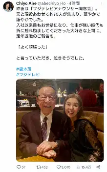 フジテレビの元アナウンサーで現在は報道局に勤務する阿部知代さん(60)が25日、自身のX(旧ツイッター)を更新し、「フジテレビアナウンサー同窓会」に出席したことを報告した。