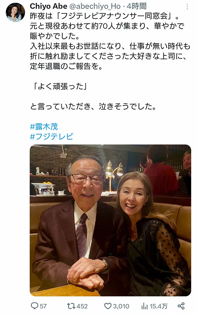 また「入社以来最もお世話になり、仕事が無い時代も折に触れ励ましてくださった大好きな上司に、定年退職のご報告を。『よく頑張った』と言っていただき、泣きそうでした」とつづり、元フジテレビのエグゼクティブアナウンサーで、フリーの露木茂アナウンサー(82)との2ショットを投稿した。