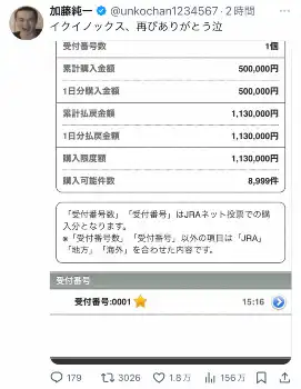 ファンからは「おぉ~凄い!おめでとうございます!」「帯だー!!!」「また、勝っちゃいましたか」「すごすぎ」「一番人気でも50万突っ込めるのが凄い!!」「最強」と反響が寄せられている。