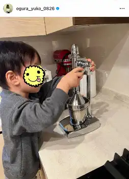続けて「最近、オレンジを絞って朝ごはんにフレッシュジュースを飲むようになりました」とし、3歳の三男がジューサーを使う様子を添え「三男も上手に絞っています」とつづった。