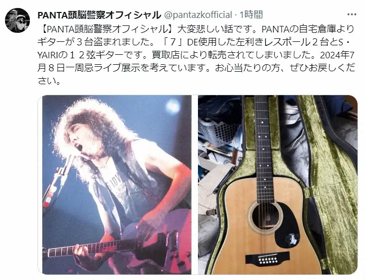 「頭脳警察」ボーカルのPANTAさん(頭脳警察公式サイトから) Photo by 提供写真 「頭脳警察」PANTAさん遺品ギター3台窃盗 来年「一周忌ライブ」での展示… ギャラリーで見る この記事のフォト 2023年11月30日の画像一覧 もっと見る 2023年11月30日の画像をもっと見る