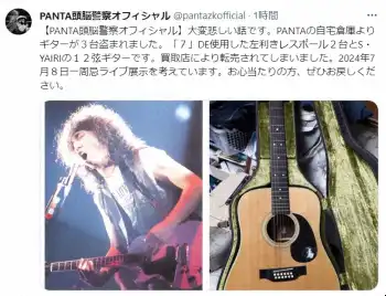 肺がんのため今年7月7日に亡くなったロックバンド「頭脳警察」のボーカルPANTAさん(享年73)の公式SNSが30日に更新され、自宅倉庫からギター3台が盗難被害に遭ったと報告した。2024年7月8日に開催を予定している「一周忌ライブ」での展示を予定していたもので、「情報提供を」と呼びかけた。