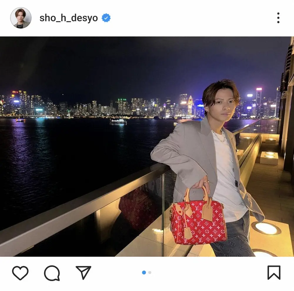 「@louisvuitton から2024プレフォール メンズ・ファッションショーにご招待頂き、香港にお邪魔してます」と書き出すと、香港の夜景をバックにグレーのジャケットに白のインナー、黒のデニムにルイ・ヴィトンの赤のバッグを手にしたショットをアップ。
