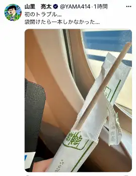 山里は「初のトラブル…袋開けたら一本しかなかった…」と割り箸袋の中に1本だけ入った箸の写真を投稿した。
