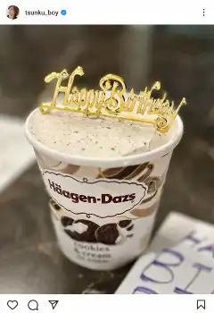 つんく♂は「妻のバースデー」とコメント。つんく♂が「誕生日ケーキ、どうしよっかな~」と悩んでいたところ、妻から「私、ハーゲンダッツ丸ごとが一番の幸せなんよね~」と提案があったことを明かした。