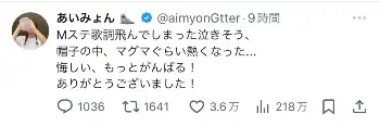 あいみょんは「Mステ歌詞飛んでしまった泣きそう、帽子の中、マグマぐらい熱くなった...悔しい、もっとがんばる!ありがとうございました!」と生放送で歌詞が飛んでしまったと告白。