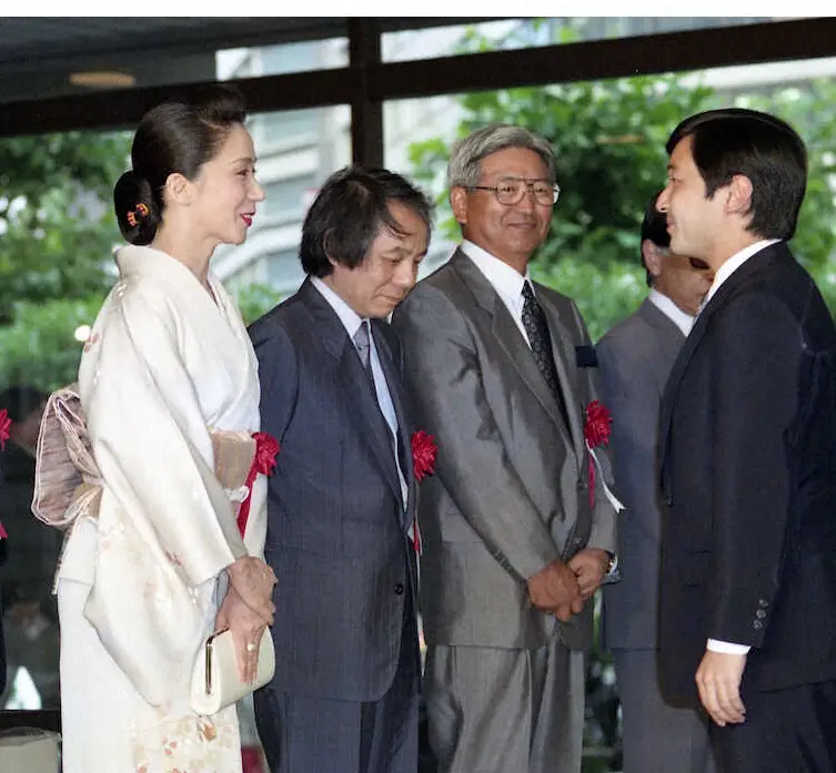 1990年、映画「少年時代」の試写会に出席された天皇陛下(当時皇太子)を出迎える(左から)岩下志麻、山田太一さん、篠田正浩監督