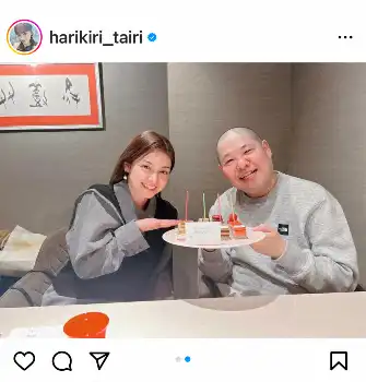 「お食事も美味しくてずっと笑いっぱなし 三瓶さんが先月23日お誕生日だったのでお祝いも兼ねて」とケーキを手にした三瓶とのツーショットも公開。