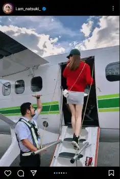 「フィリピンの島に上陸。マニラから専用機でパマリカン島へ 早朝に羽田空港を出たのですっぴんですがこんなワクワク体験ないから記念に写真撮ったよ これからフィリピンの旅の投稿が続きます」とつづり、ショート丈の黒のトップスにクレーのタイトミニ姿で飛行機に乗り込んでいる写真をアップした。