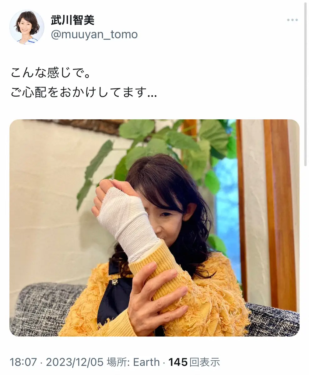 武川智美アナウンサー Photo by スポニチ MBS・武川智美アナがロケ中にスケートリンクで転倒、全治3カ月の骨折 局… ギャラリーで見る この記事のフォト 2023年12月05日の画像一覧 もっと見る 2023年12月05日の画像をもっと見る