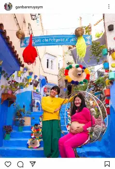 色とりどりの鉢植えで飾られた青い階段を背景に、ハンギングチェアに座るよしこが膨らみのあるお腹に手を添え、まひるも笑顔で寄り添う一枚を公開。「世界の果てまでイッテQ ガンバレルーヤのカレンダープロジェクトinモロッコ ありがとうございました」とつづった。