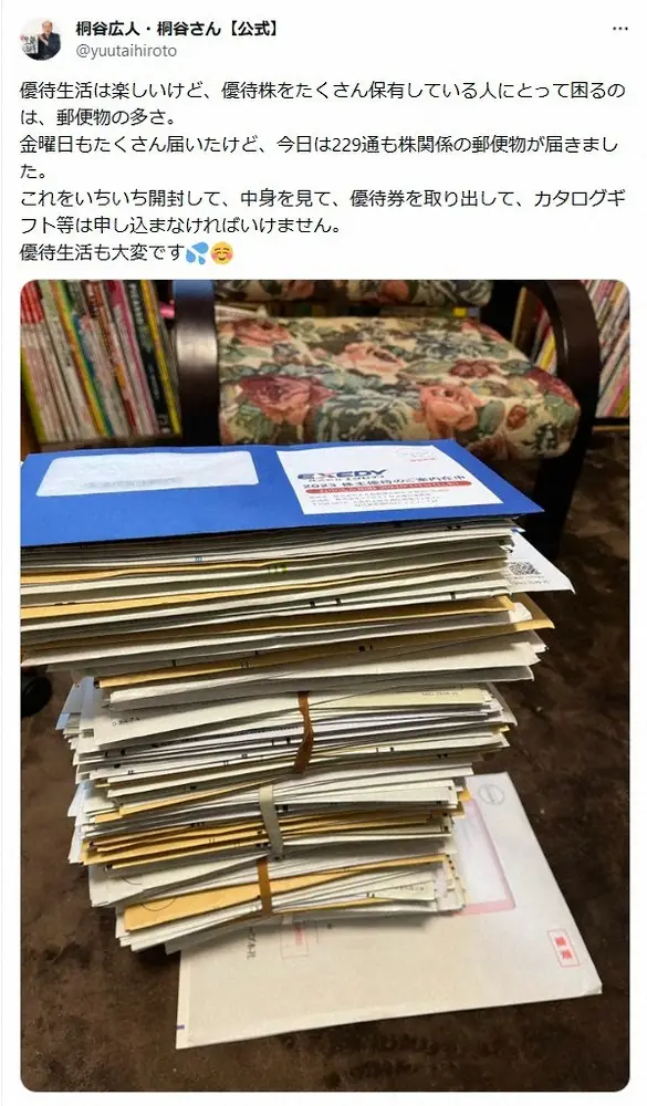 桐谷広人さん Photo by スポニチ 投資家・桐谷広人さん 「優待生活も大変です」意外な悩みが話題「ハード… ギャラリーで見る この記事のフォト 2023年12月06日の画像一覧 もっと見る 2023年12月06日の画像をもっと見る