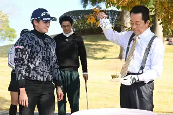 前回、「水谷さんに会いたい!右京さんに会いたい!」と熱望していたと木梨に暴露された渋野は、「本当に感激です!」と夢がかなって大喜び。一方の水谷は、「普段はテレビで拝見しているので、まだ女子プロの皆さんの顔をまともに見られません(笑)」と、思わず照れ笑いを浮かべた。