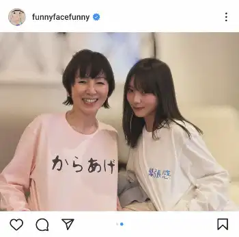 「好きな食べ物聞かれて『からあげ』と答えたら、絶妙にダサい『からあげ』Tシャツを作ってくれました おもろ。与田ちゃんグッズをマネージャー(私のね)Kちゃんに借りて盛り上がった夜 なんかおもしろいアイドル。与田ちゃん推しとして、今度はコンサート参戦しよー」とつづると、2人でロンTのロゴを見せる写真も投稿した。