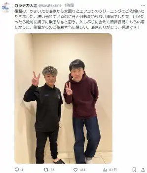 入江は「後輩の、かまいたち濱家から水回りとエアコンのクリーニングのご依頼いただきました」とつづり、お笑いコンビ「かまいたち」の濱家隆一とのツーショットをアップ。