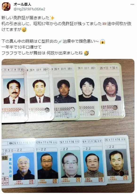 「机の引き出しに、昭和57年からの免許証が残ってました」と、若き頃から現在までの免許証10枚を並べて投稿。「途中何枚か抜けてますが」としつつ、「下の真ん中の時期はC型肝炎の治療中で顔色悪い~一年半で10キロ痩せてフラフラでしたが舞台は何故か出来ましたね」と、思い出にしみじみと浸っていた。