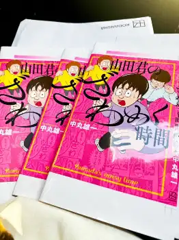 中丸は、鮮やかなピンクがひときわ目立つ単行本3冊が映る写真を添え、「山田君のざわめく時間、表紙のサンプルきたぁーーー!!!素材違いですかね。完成までの終盤、次々と意思決定をしていく」とツイート。